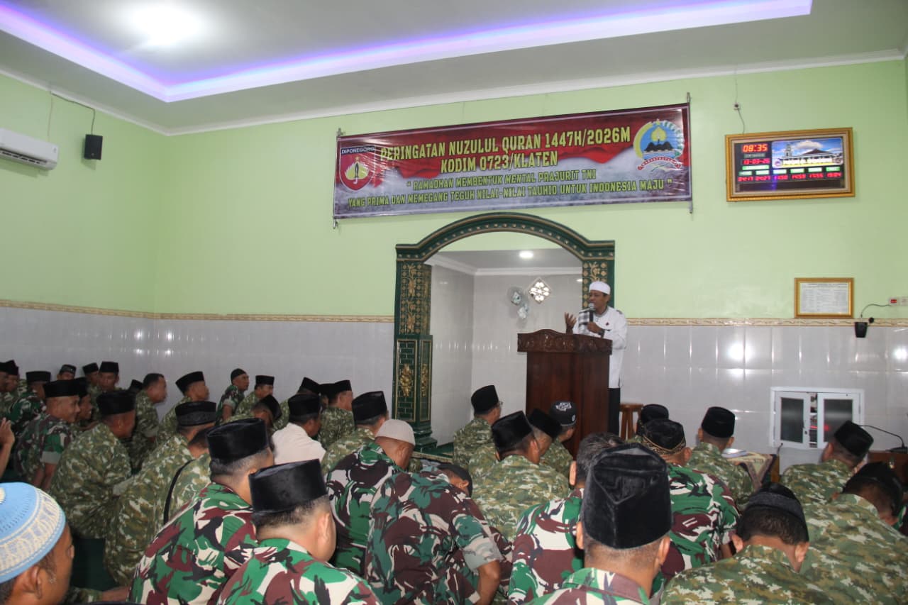KLATEN – Bhayangkara-lipsus.com – Kodim 0723/Klaten menggelar peringatan Nuzulul Qur’an pada bulan suci Ramadhan 1447 H/2026 M yang dilaksanakan di Masjid Al Mujahidin, Asrama Kodim 0723/Klaten, Desa Karanglo Kecamatan Klaten Selatan, Kabupaten Klaten, Jumat (13/3/2026). Kegiatan ini menjadi momentum untuk meningkatkan keimanan dan ketakwaan prajurit, PNS serta keluarga besar Kodim 0723/Klaten melalui penghayatan nilai-nilai Al-Qur’an.