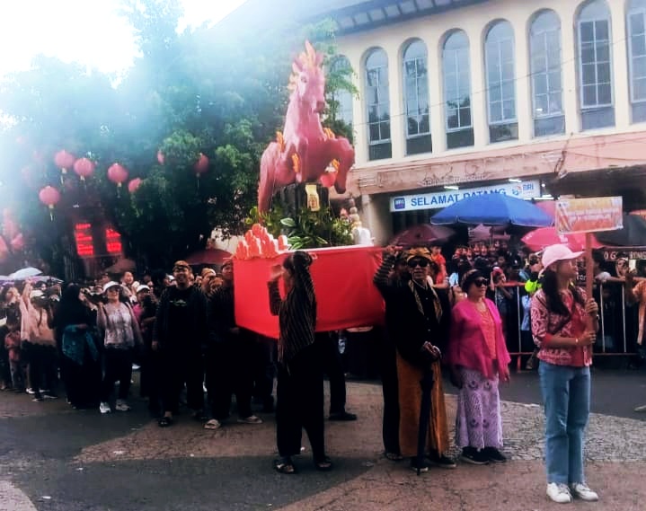 Parade dimulai dari pasukan Paskibra yang membawa gambar Burung Garuda, dilanjutkan dengan korps drum band, dan atraksi liong serta barongsai maupun miniatur pasar gede Panitia juga telah menyiapkan jodang atau gunungan berisi ribuan kue keranjang yang siap dibagikan.Warga dari berbagai daerah tetap bertahan di lokasi meski basah kuyup demi mendapatkan kue keranjang yang disebar maupun yang ada di jodang.dalam sambutan wakil walikota Astrid Widayani memberikan apresiasi tinggi atas kesuksesan acara tersebut