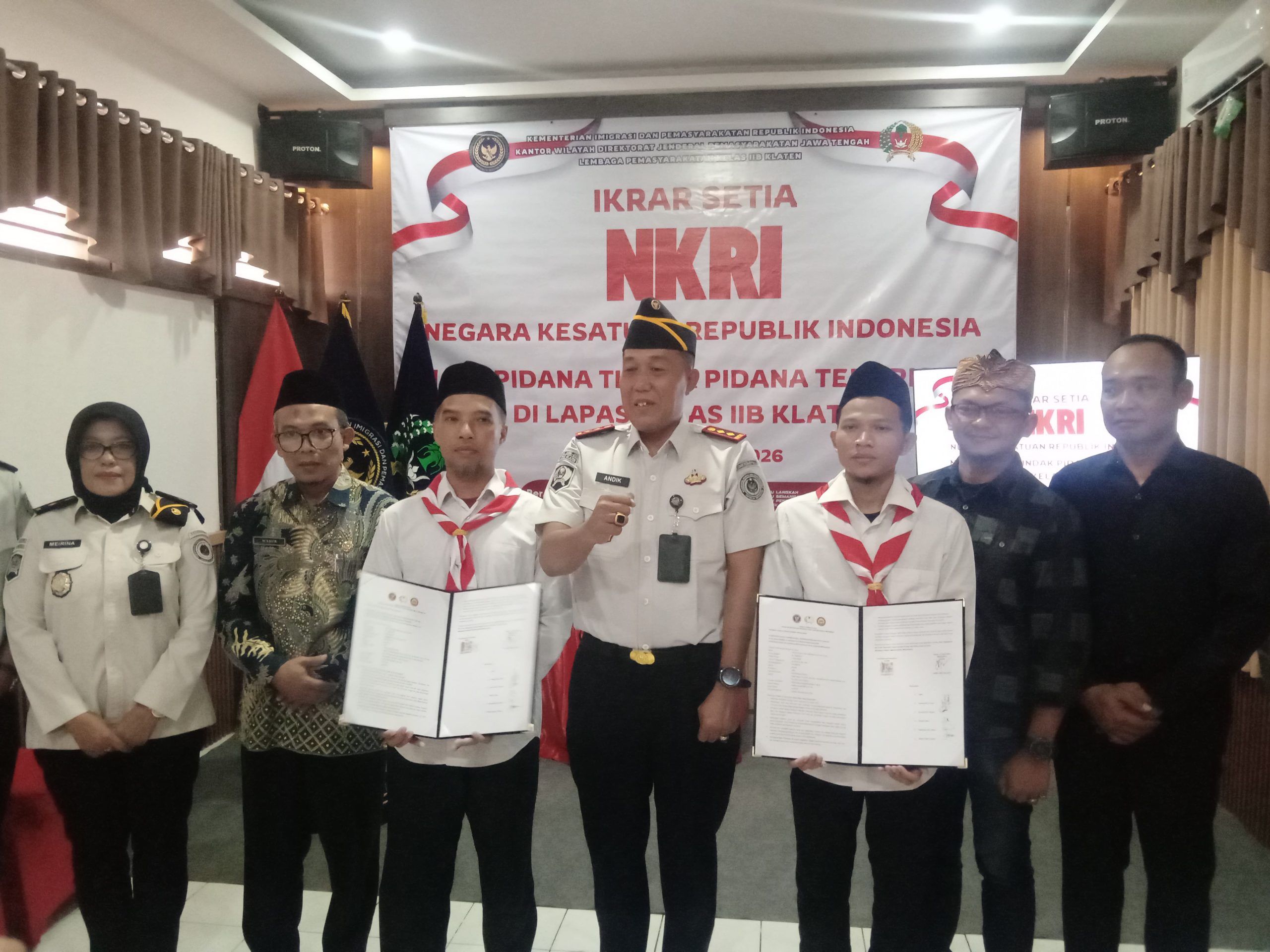 KLATEN — Bhayangkara-lipsus.com -Lembaga Pemasyarakatan (Lapas) Kelas IIB Klaten menggelar kegiatan ikrar setia kepada Negara Kesatuan Republik Indonesia (NKRI) yang dikuti oleh dua narapidana kasus terorisme pada Rabu (22/04/26)
