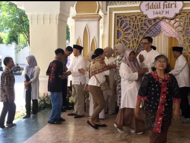 Pengunjung tampak antre untuk bersalaman langsung dengan pimpinan daerah. Suasana berlangsung tertib dan penuh kebersamaan di momen hari raya.